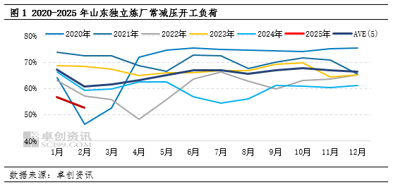 从炼油效益角度分析,2025年春节前后因国际油价下跌而关键产品汽柴油价格上涨,山东独立炼厂理论利润水平得以修复,利于独立炼厂提升开工负荷。但是,一方面燃料油消费税按照应收抵扣政策落地,导致以燃料油为主要加工原料的炼厂生产成本增长明显,被动降低生产负荷或停工检修;另一方面独立炼厂青睐的部分性价比高的原料受客观因素制约不能按时靠港,双重因素下山东独立炼厂开工负荷不升反降。卓创资讯数据显示,春节后2025年2月5日当周,山东独立炼厂利润为393元/吨,环比增179元/吨或83.7%,同比增223元/吨或131.5%。